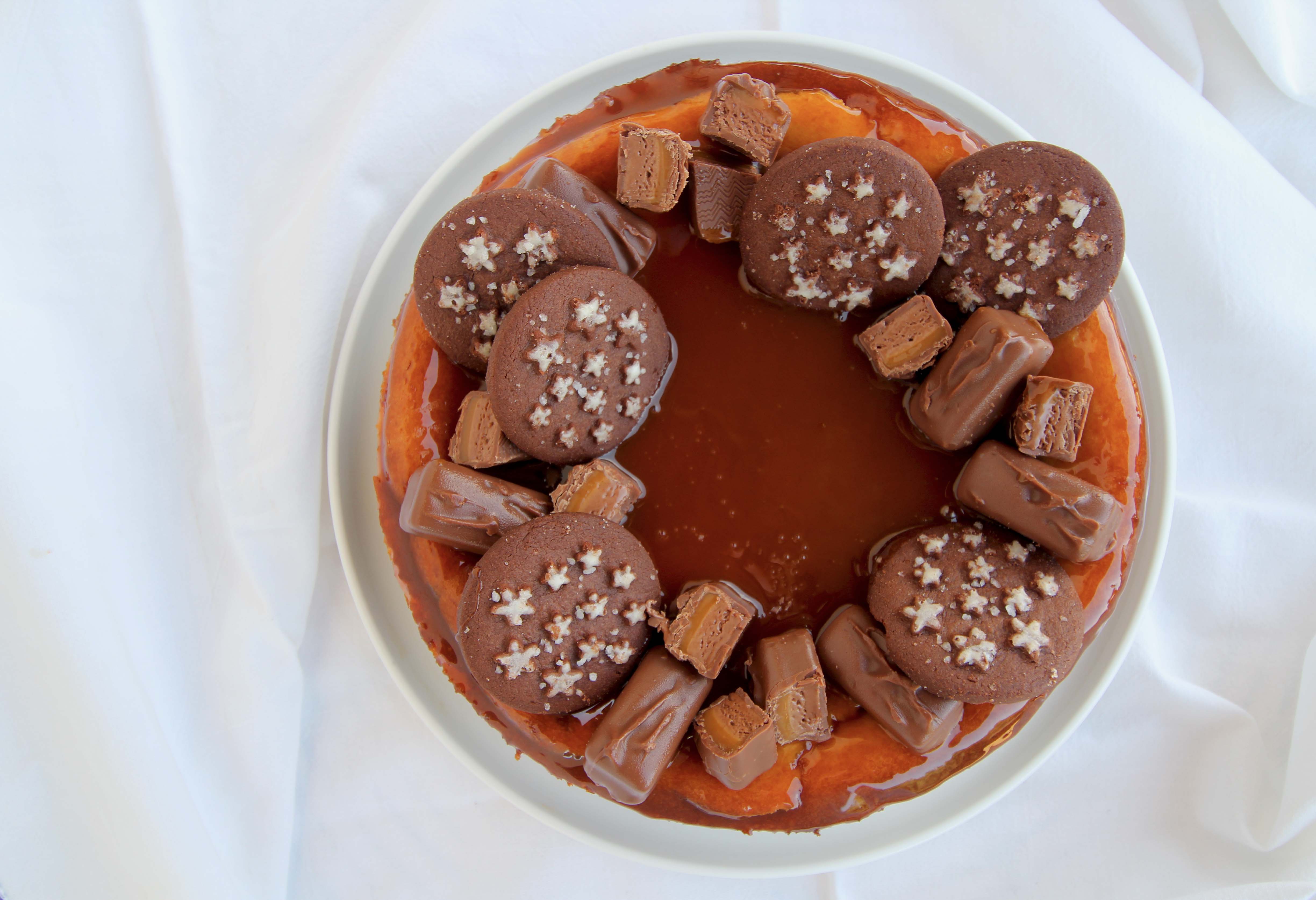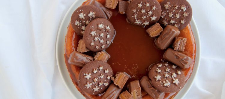 • Freddare bene prima di decorarla. Per la copertura ho usato la salsa già pronta al Caramello Toffee (noi la conosciamo come salsa mou), cioccolatini mini Mars e biscotti Pan di stelle